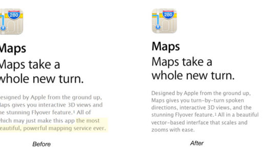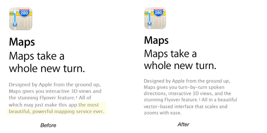 Zdá sa, že patálie okolo máp obsiahnutých v systéme iOS 6 nemajú konca. Po ospravedlnení miestami nepraktickej aplikácie integrovanej v najnovšej verzii mobilného systému spoločnosti Apple, spoločnosť musela potichu zmeniť aj ich popis na oficiálnej stránke produktu. Zmena sa týka vety „All of which may just make this app the most beautiful, powerful mapping service ever,“ ktorá po udalostiach posledných dní neznie moc pravdivo.