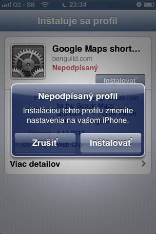 2. Vyberte si na danej adrese jeden zo súborov s príponou .mobileconfig, ktoré prináležia konkrétnemu prístroju. Po otvorení odkazu sa vám objaví obrazovka s nastaveniami, ktorá od vás žiada inštaláciu profilu. Keďže je tento balík „Unsigned“, systém vás ešte pred inštaláciou upozorní na túto skutočnosť a pri inštalácii vás požiada o jej odsúhlasenie.
