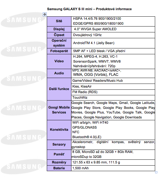- Samsung GALAXY S III mini se na českém trhu objeví v druhé polovině listopadu za cenu 8 999 CZK.
