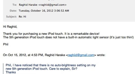 Istý Raghid Harake si po zakúpení svojho iPodu touch 5. generácie všimol absenciu automatického jasu. Na jeho e-mail reagoval Phil Schiller so slovami, že prístroj je jednoducho príliš tenký na to, aby obsahoval senzor osvetlenia.