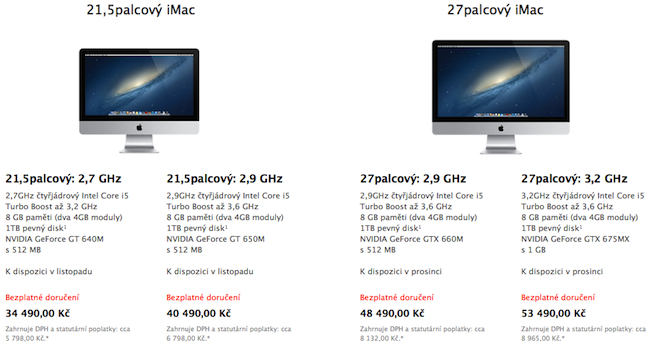 Poslednou dôležitou informáciou je cena a dostupnosť nového iMacu. Pokiaľ ste si plánovali kúpiť 21,5-palcový model tohto počítaču, dočkáte sa ho v priebehu budúceho mesiaca, novembra. Inovácia sa odrazila aj na výslednej cene produktu, ktorý je teraz výrazne drahší. Základná 21.5-palcová verzia nás vyjde o 6 500 Kč viac, teda 34 490 korún, pokročilejšia len o 5 500, teda 40 490 korún. Základný 27-palcový iMac môže byť váš už za 48 490 Kč a variant s 3.2GHz procesorom za 53 490 korún českých. Verzie s 27-palcovým displejom sa však do predaja dostanú až v priebehu decembra 2012. Sami sa môžete presvedčiť na obrázkoch nižšie.