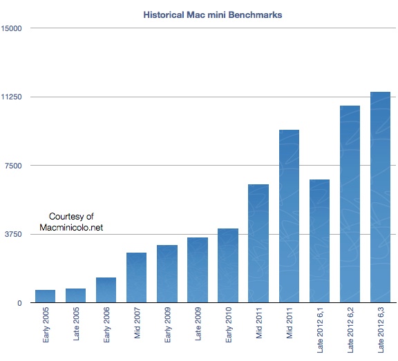 Mac mini se jako první dostal do rukou novinářů, kteří provedli Geekbench testy a zjistili, že nový model zaznamenal s předinstalovaným OS X 10.8.1 skóre 7433 bodů. Mac mini 2011 se systémem OS X 10.8.2 dosahuje skóre 6584. U Mac mini tedy došlo k nárustu o téměř 1000 bodů v surovém výkonu Geekbench testů. Co se týká balení Mac mini, to zůstalo stejné jako u předchozí generace. Apple mírně optimalizoval vnitřní uspořádání součástek, což by mělo vést k lepšímu chlazení počítače. Co je smutné tak surový výkon Mac mini 2012 je srovnatelný s výkonem základního modelu Mac Pro.