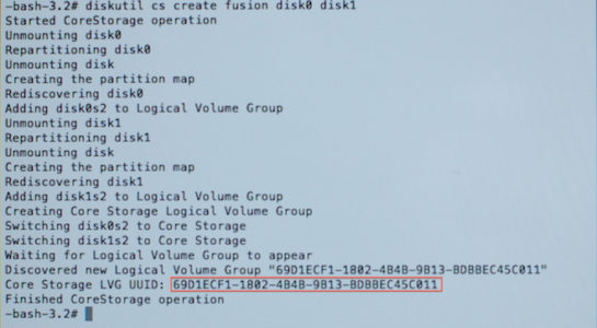 diskutil cs createVolume 69D1ECF1-1802-4B4B-9B13-BDBBEC45C011 jhfs+ Fusion 285g