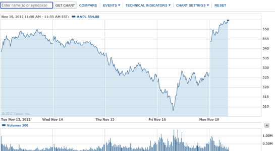 CNN dnes oficiálne potvrdilo stretnutie hlavy Spojených štátov Amerických, Baracka Obamu, s riaditeľmi štyroch spoločností zo zoznamu Fortune 500, medzi ktorých patrí i CEO kalifornskej spoločnosti Apple, Tim Cook. Práve toto stretnutie malo veľmi priaznivý dopad na akcie spoločnosti, ktorých hodnota sa po dlhom čase vyšplhala nahor až o vyše 25 dolárov za kus a ich hodnota sa aj naďalej udržuje vysoko. Aktuálna hodnota akcii spoločnosti Apple [AAPL] je $554.95.