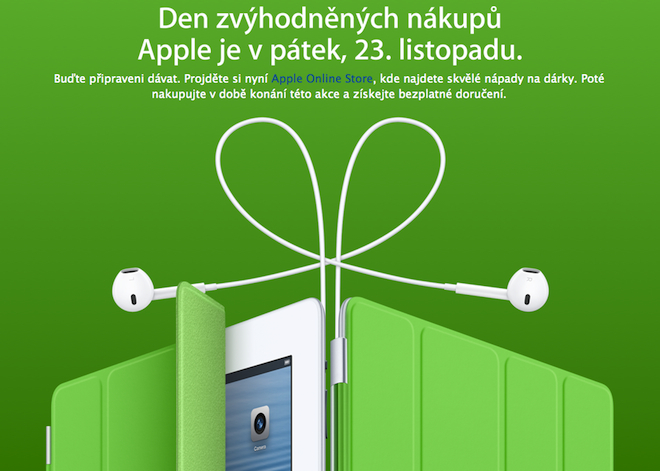 „Buďte připraveni dávat. Projděte si nyní Apple Online Store, kde najdete skvělé nápady na dárky. Poté nakupujte v době konání této akce a získejte bezplatné doručení,“ hlásá slogan na Apple.cz. Pokud tedy chcete ušetřit a získat zdarma poštovné, připravte se na tento pátek, kdy bude možné nakupovat se slevou. Bližší informace o Černém pátku se dozvíte v našem článku Černý pátek, den kdy se vyplatí koupit Apple.