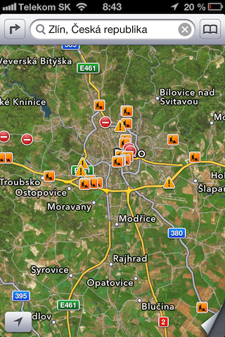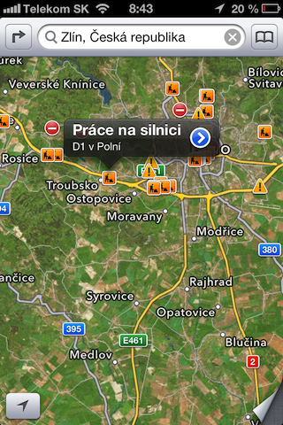 Apple Maps nabízí kromě hry na schovávanou s některými městy v ČR také zajímavou možnost jak zobrazit aktuální informace o dopravních omezeních a uzavírkách. Díky spolupráci Applu se společností TomTom a dalšími třemi desítky společností, získávají uživatele i v ČR a SR velmi kvalitní informace aktuální dopravní situaci na českých a slovenských silnicích a dálnicích.