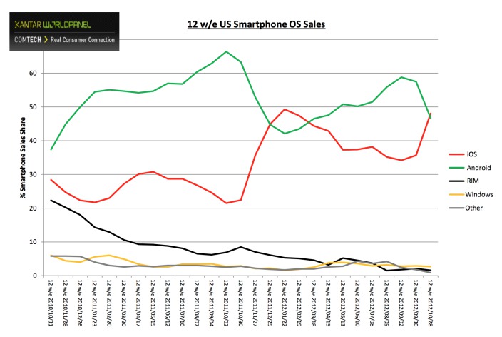 Google Android už nedominuje americkému mobilnému trhu. Podľa analytickej firmy Kantar WorldPanel totiž podiel telefónov iPhone na americkom trhu vzrástol až na 48,1%, čo je viac ako dvojnásobok oproti minulému roku. Podiel konkurenčného mobilného operačného systému od Google podľa spoločnosti klesol v priebehu roka zo 63,3 percenta len na 46,7%, vďaka čomu je tak Android v tesnom závese za Apple iOS. Spoločnosť Apple môže tomuto veľkému nárastu ďakovať najmä iPhone 5.