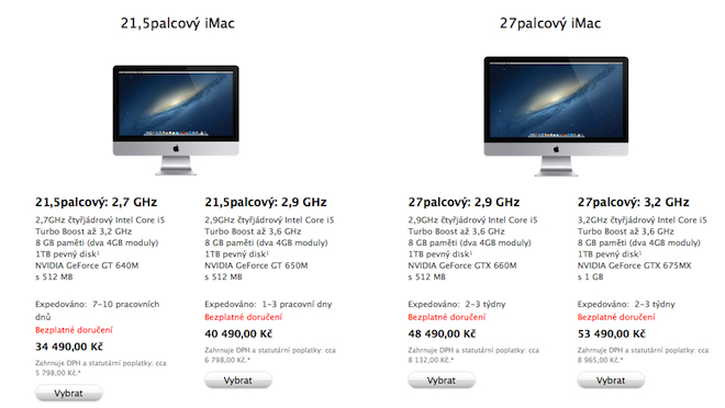 Po zhruba dvou tisících opakování pro jistotu ještě dodáme, že při nákupu na Apple.cz samozřejmě získáváte dvouletou standardní záruku, na kterou jsme v ČR zvyklí. Počítače je možné objednat pouze při platbě kreditní kartou a pokud máte své Apple ID, stačí jej při objednávce vyplnit, nic ostatního již zadávat nemusíte. Apple následně potvrdí vaši objednávku a bude vás dále informovat v momentě kdy zboží odešle. Nové iMacy můžete objednávat přímo zde. Jen pro zajímavost doplním, že pokud se rozhodnete objednat si 27″ iMac v nejvyšší doplňkové konfiguraci s 768GB SSD diskem, Intel Core i7 na 3,4Ghz s 32GB RAM a grafickou kartou GTX680MX, musíte si připravit 111 990Kč. Více informací o nových modelech počítače Apple iMac si můžete přečíst v článku Apple představil novou generaci iMaců: dokonalý design za zajímavou cenu.