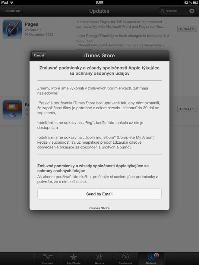 Apple dnes nečakane zmenil zmluvné podmienky obchodu iTunes Store, ktorý je centrom legálneho nákupu hudby, videa a filmov pre zariadenia so systémom iOS a set-top box Apple TV. Skorá decembrová aktualizácia odstraňuje akékoľvek zmienky o zrušenej nepopulárnej službe iTunes Ping, taktiež odstraňuje odkazy na funkciu Complete my Album a pridáva skript, ktorý vám oznámi, že po zapožičaní filmu máte 30 dní na to, aby ste film do vášho zariadenia stiahli.