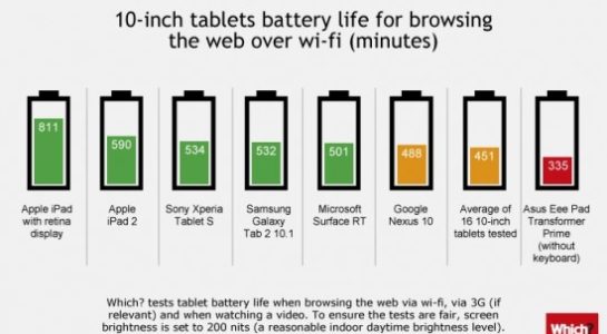 Anglický časopis pro spotřebitele Which?, tedy obdoba našeho slavného Dtestu zveřejnil odbornou analýzu výdrže baterie jednotlivých tabletů s 10″ a se 7″ obrazovkou. Všechny tablety během testu surfovali na internetu pomocí Wi-Fi a jejich jas byl nastaven na 200 nits. Během tohoto testu dokázal vydržet iPad 4. generace, tedy Apple iPad s Retina displejem v provozu neuvěřitelných 811 minut, tedy 13 a půl hodiny a stal se tak absolutním vítězem testu s náskokem 221 minut před tabletem který se umístil na druhém místě, tím však nebyl nikdo jiný než iPad 2. generace, který vydržel v provozu 590 minut, tedy 9,8 hodin.