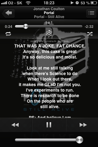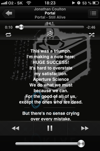 Pieseň teraz už obsahuje svoj text, respektíve text, ktorý ste jej Vy napísali a bude prítomný na zariadeniach iPod alebo iPhone, na ktoré skladbu pridáte za pomoci synchronizácie. V prípade iPod Touch a iPhone text zobrazíte klepnutím prstu po obrazovke, po ktorom sa okrem samotného textu objaví aj známy ovládací panel hudobného prehrávaču.