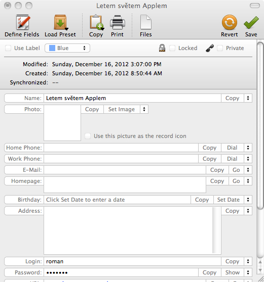 V případě, že vybereme například přístupy k webovým službám pod položkou Web, zobrazí se jednoduchý formulář, do kterého vyplníme vše potřebné a nepotřebné položky vymažeme nebo naopak ty které nám chybí jednoduše přidáme. Samozřejmostí je možnost přidat například logo daného webu nebo v případě kontaktů fotografii. Obrovskou výhodou je také možnost přidat k dané položce soubory. V případě přístupu k internetovému bankovnictví, ke kterému používáte certifikát v počítači, tak můžete rovnou spolu s přihlašovacími údaji také přiložit daný certifikát.