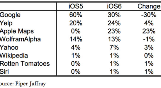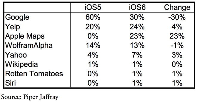 Kým služby Google využívala hlasová asistentka na iOS 5 až vrámci 60% všetkých odpovedí, s príchodom iOS 6 sa táto „spotreba“ znížila len na 30%, za čo môže najmä prítomnosť nových Apple Maps, ktoré výrazne odobrali percentá najvýznamnejšiemu internetovému vyhľadávaču. Okrem máp však pribudli aj ďalšie zdroje a Siri tak teraz už vie vyhľadávať hodnotenia a informácie o filmoch zo serveru Rotten Tomatoes, ale taktiež už dokáže napríklad spúšťať aplikácie, diktovať statusy na Facebook alebo nastavovať budík na tablete iPad.