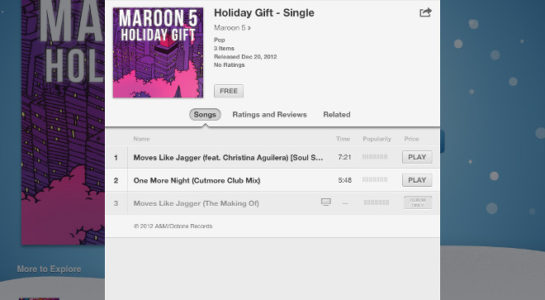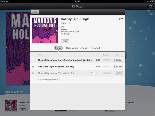 Tak ako minulý rok, aj tento rok spoločnosť Apple obdarúva svojich klientov a používateľov jej služieb sériou dvanástich digitálnych darčekov v podobe iTunes 12 Days of Christmas. Keďže prvý deň je dnes, 26. decembra 2012, spoločnosť už zverejnila prvý svoj darček a používatelia iOS zariadení, na ktoré si stiahli rovnomennú, voľne dostupnú aplikáciu, dnes dostali prvé upozornenie na nový darček. Nový darček je teraz špeciálny singel Holiday Gift od Maroon 5 a obsahuje dve skladby a jedno video.