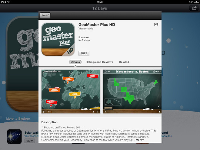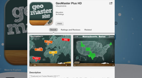 Vianočné dni znovu pokračujú aplikáciou, teraz orientovanou na vzdelanie, najmä geografické znalosti našej planéty. Zároveň sa však jedná i o hru s podporou Game Center, ako aj špeciálnou verziou pre iPad. Tá nesie meno Geomaster Plus HD a je dnes taktiež voľne dostupná.