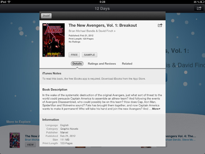 Popri aplikáciach a hudbe Apple vrámci programu 12 Days of Christmas ponúka zadarmo aj knihy, alebo v tomto prípade komiksy. Štvrtým vianočným darčekom je prvá epizóda Marvel komiksu The New Avengers, Breakout od autorov Briana M. Bendisa a Davida Fincha.