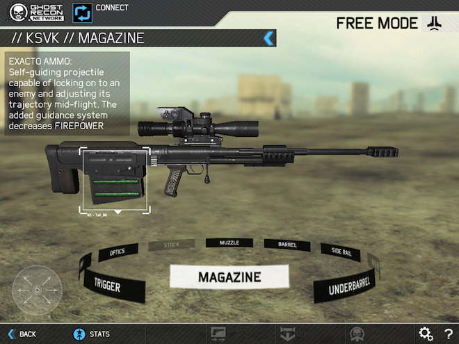 Právě na úpravy zbraní se soustředí samotná aplikace GR Network nebo také Ghost Recon Future Soldier. Aplikace totiž nabízí stejné menu pro úpravu zbraní jako PS3/XBOX nebo PC. Zbraně je možné rozložit, upravit, složit, přiblížit a otáčet ve všech úhlech. Samozřejmě se automaticky na iPadu/iPodu/iPhonu zobrazují také vlastnosti dané zbraně při jednotlivých úpravách a veškeré možnosti, které zbraň nabízí. Abychom se dostali k samotnému propojení hry pro konzole a počítač s aplikací pro iPad. Aplikaci můžete používat i bez toho, aniž byste měli hru koupenou v takzvané Free Mode, kde si zkrátka jen můžete upravovat zbraně. Pokud však vlastníte Future Soldier na PC, PS3 nebo Xbox, můžete se jednoduše připojit do herní sítě Uplay, kam stačí připojit iPad a zbraně které vytvoříte na iPadu se automaticky uloží do vašeho Uplay profilu. Pokud následně zapnete konzoli nebo PC a spustíte Future Soldier, jsou vám zbraně vytvořené na iPadu plně k dispozici. Hra je samozřejmě propojena také zpětně, což znamení, že pokud hrajete kampaň a nemáte zatím odemknuté veškeré zbraně, aplikace na iPadu dovolí upravit pouze již použitelné zbraně.