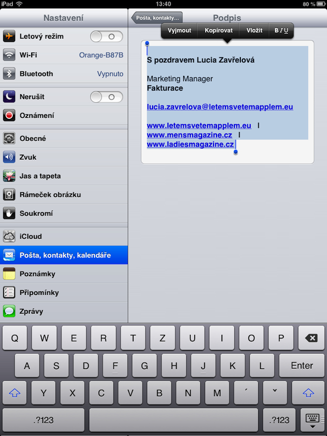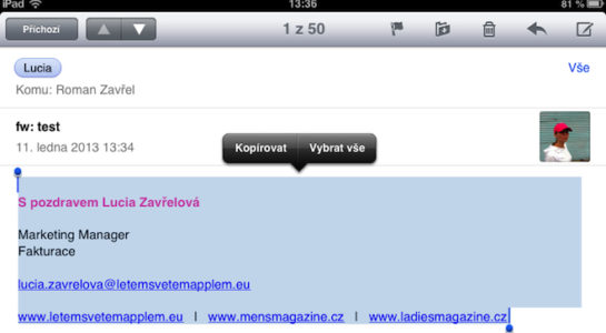 - Podržte prst nad textem podpisu – defaultně je text: Odesláno z mého iPhone (případně iPadu nebo iPodu touch). Objeví se nabídka Vybrat, Vybrat vše a Vložit.
