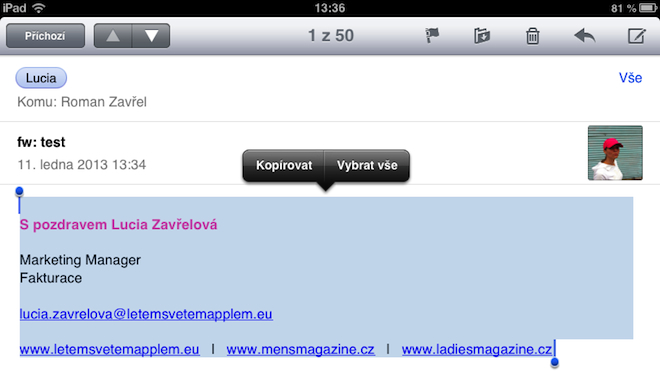 - Otevřete mail s podpisem, který si přejete používat v iOS zařízení.