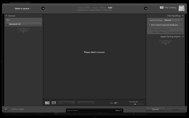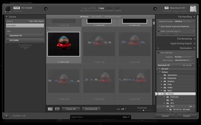 Import. První krok je Import. Jedná se tedy o to, dostat vaše fotky z fotoaparátu do vašeho Macu. Doporučuji neimportovat fotky připojením fotoaparátu přes USB. Zvykněte si vytáhnout vaší SD kartu z fotoaparátu a ten nechat v batohu. Důvod je jednoduchý, hlavně v zimním období. Zmrzlý fotoaparát přinesete promrzlý z venku a vyndáte jej do pokojové teploty. Fotoaparát se orosí nejen z venku, ale i ze uvnitř. Může se stát, že vám z toho „onemocní“. Proto je lepší nechat ho aklimatizovat v batohu a mezitím, co se aklimatizuje, se už můžete bezpečně probírat v nových fotkách.