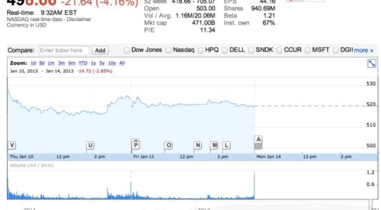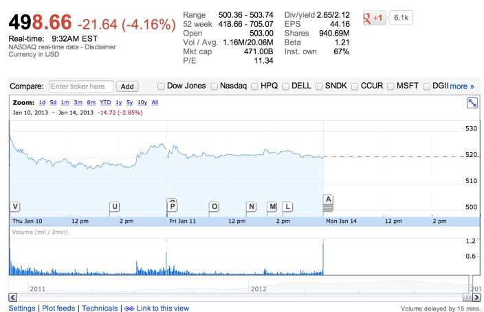 Akcie se dostaly pod 500$ za kus poprvé od února/februára 2012. Jediná zpráva Wall Street Journal, kterou navíc není možné nijak ověřit, tak způsobila pokles více než 20$ na každém kusu akcií.