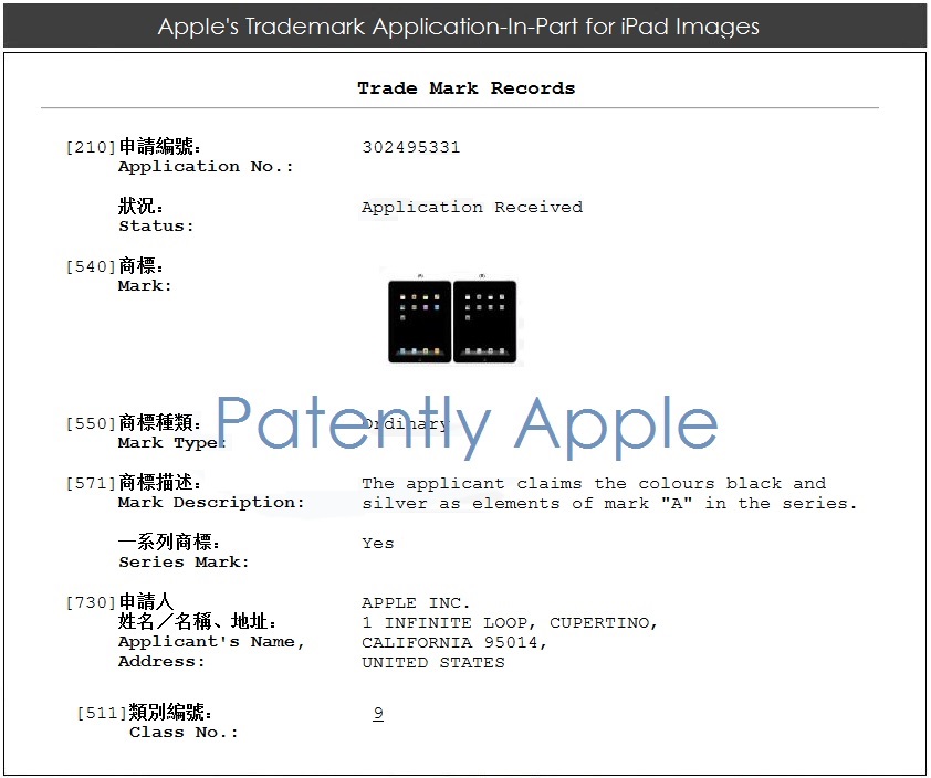 Patent s aktuálnym označením 302495331 predstavuje dvojicu nákresov prednej strany tabletu, vo farebnom i čiernobielom prevedení. Farebná verzia tak prezentuje presné farby ikon v používateľskom prostredí systému iOS, vďaka čomu budú môcť prípadní falšovatelia byť potrestaní. Žiadosť o aplikáciu patentu obdržal Čínsky patentový úrad v piatok, no k jeho schváleniu zatiaľ nedošlo. Patent bol zaradený do kategórie International Class 009, ktorá zahŕňa všemožnú počítačovú techniku a teda je medzi nimi možné nájsť napríklad prenosné prehrávače, čítačky, GPS či kamery.