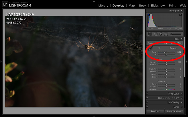 Začneme tedy od shora. První co vám Develop (kl. zkratka D) nabízí je upravení vyvážení bílé neboli white balance (WB). Jedná se o barevný nádech, který má vaše fotka. Někdy se může stát, že zapomenete zvolit správné nastavení WB na vašem fotoaparátu. Fotografie pak může mít například modrý nádech. Tuto vadu lze snadno opravit posuvníkem, viz. obrázek. Měníte tak tedy teplotu fotografie. Lze využívat i přednastavené možnosti. Nicméně není nad to, nastavit si WB sám. Další možností je změnit odstín. Doporučuji vždy zatáhnout posuvníkem do krajních pozic. Nejlépe tak zjistíte, co daná funkce dělá. Dvojím klikem na posuvník jej pak vrátíte do původní pozice.