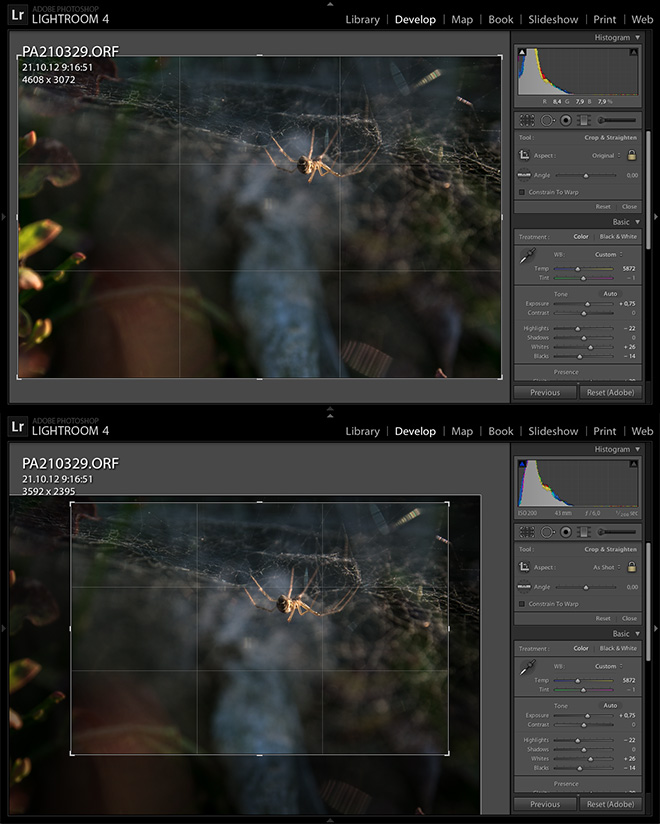 Oříznutí neboli crop je velice důležitá funkce, kterou najdete v horním panelu pod histogramem. Někdy je dobré oříznutím fotografie začít. Já osobně si ořezávání nechávám až po výše zmíněných úkonech, kdy už mám určitou představu o tom, jak bych si fotografii představoval. Oříznutím docílíte lepší kompozice a zvýraznění hlavního předmětu fotografie. Také ale můžete opravit horizont, což je častá chyba začínajících fotografů. Není nic horšího, než výlévající se moře z fotografie, padající budova atd. a to vše jen kvůli nakloněnému horizontu. Crop nabízí i přednastavené poměry, což je velice praktické. Až budete se svým výběrem spokojeni, stačí jej potvrdit klávesou enter.