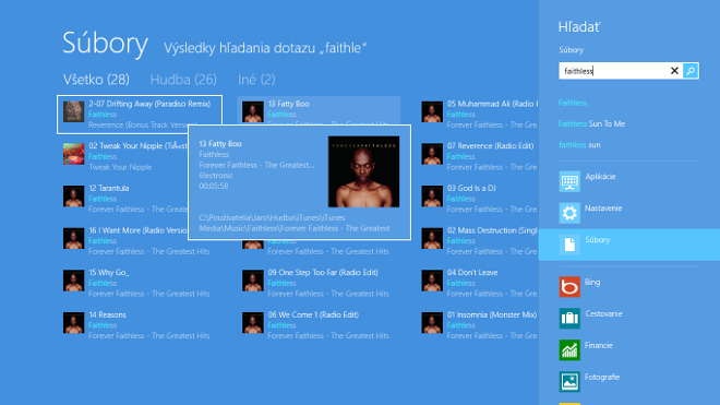 Vyhľadávanie je teraz v porovnaní s Windows Vista a Windows 7 omnoho rýchlejšie, avšak stále nie najdokonalejšie. Po napísaní slova máte totiž bežne otvorenú sekciu „Aplikácie“, a teda ak hľadáte konkrétny súbor či nastavenia, musíte klepnúť na jednu z týchto dvoch kategórii. Nový operačný systém vám však prácu uľahčuje a po napísaní vyhľadávaného výrazu vám Windows podľa dostupných súborov skúsi vypísať ďalšie námety na kľúčové slová, ako aj vypíše počet výsledkov pri každej z troch kategórii. Okrem toho vám Vyhľadávanie umožní vyhľadať pojem v konkrétnej aplikácii, napríklad obchode Store či aplikácii Wikipedia, ktorú je možné bezplatne z tohto obchodu stiahnuť. Rýchlosť je skutočne na vysokej úrovni a podľa testov dosahuje úrovne Spotlight u systémov OS X a iOS, ktoré je takmer okamžité a aj preto si odo mňa Microsoft zaslúži pochvalu.