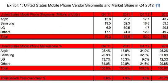 Výkonný riaditeľ analytickej spoločnosti Neil Mawston tvrdí: „Odhadujeme, že Apple predal 17,7 milióna zariadení, ktoré tak tvorili až 34% všetkých predaných telefónov v štvrtom štvrťroku 2012 na Americkom trhu. Toto je prudký nárast oproti 4. štvrťroku 2011, kedy Apple predal len 12,8 milióna prístrojov a mal len 25-percentný podiel na trhu. Apple tak vôbec poprvýkrát získal prvé miesto v zozname najpredávanejších mobilných výrobcov na trhu USA. Tento úspech je poháňaný populárnym ekosystémom iPhone a App Store, veľkorysými dotáciami operátorov a rozsiahlym marketingom ohľadom nového iPhone 5.“