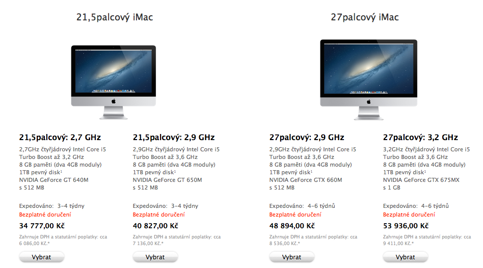 Zatím co první dneění zpráva o snížení doručovacího času iPad mini při objednávce z Apple.cz naše čtenáře potěšila, nyní máme špatnou zprávu pro všechny zájemce o nový počítač iMac. Apple totiž iMacy skutečně nestíhá nebo možná nezvládá vyrábět a tak se na Apple.cz stejně jako na dalších online obchodech v Evropě prodloužila čekací doba na iMac na 3-4 týdny v případě 21,5″ modelů a na 4-6 týdnů v případě 27″ modelů počítačů iMac. Apple má s dodáním iMaců problémy v podstatě od jejich vydání a Tim Cook připisoval nízké prodeje počítačů Mac v předvánočním období zejména neschopnosti Applu dodat na trh počítače iMac, které jsou nejoblíbenější stolní počítače společnosti Apple.