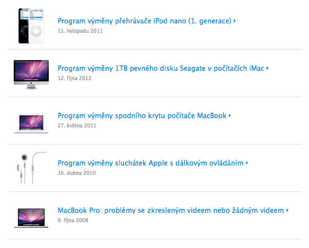 Stejně jako většina velkých společností, dokáže i Apple uznat svoji chybu a zdarma opravit nebo vyměnit produkty, které mohou prokázat i po více než dvou letech, v případě některých států po roce, tedy po uplynutí záruční doby, vady. V současné době nabízí Apple program výměny nebo opravy pro čtyři produkty. Konkrétně se jedná o spodní kryt počítačů MacBook White, 1TB Segate disk počítačů iMac, iPod nano 1. generace a sluchátka Apple s dálkovým ovládáním. Pokud tedy některý z těchto produktů vlastníte, máte nárok na bezplatnou výměnu nebo opravu i po uplynutí standardní záruční doby.