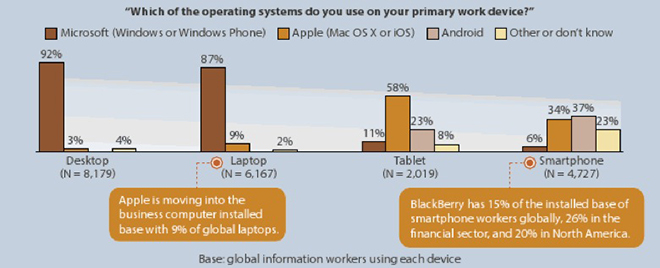 Takýmto spôsobom vzrástol i záujem o smartfóny, čiže inteligentné telefóny v tejto oblasti, vďaka čomu až takmer polovica, 48% všetkých opýtaných využíva takýto telefón aspoň raz do týždňa. V tomto prípade však prevažuje Android, ktorý preferuje 37 percent ľudí, v tesnom závese sa však drží iOS s 34% a nakoniec o podnikateľský symbol Blackberry má záujem iba 15% opýtaných. Pre Apple je tento segment trhu nesmierne dôležitý, najmä v prípade že sa zamestnanci terajších spoločností rozhodnú založiť vlastnú spoločnosť a vybaviť svojich zamestnancov firemnými mobilnými telefónmi či tabletmi. Kým 16% v súčasnosti používa telefóny iPhone, až 33% tvrdí, že chcú práve iPhone ako svoj ďalší pracovný telefón.