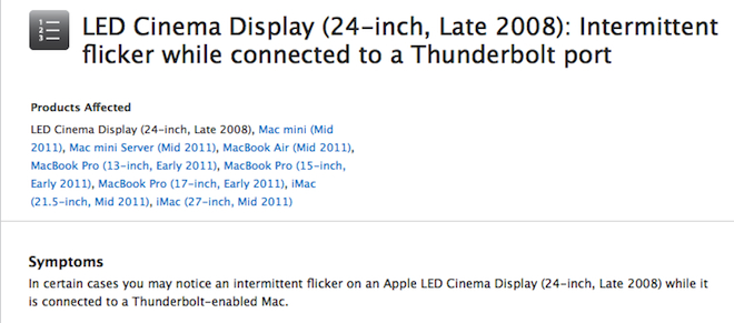 Od té chvíle jsem používal dva MacBooky Pro s tímto portem a ani na jednom nefungoval monitor tak jak by měl. Problém se projevuje tak, že když připojíte Apple LED Cinema Display k MacBook Pro s Thunderbolt portem, displej v nepravidelných intervalech problikává. Někdy problikne monitor jednou za den, někdy jednou za půl hodiny. Je jedno k jakému počítači s Thunderbolt portem jej připojíte, zkrátka problikává všude. Software Update žádné řešení v podobě aktualizace nikdy nenabízel a v sekci Apple.com/support jsem řešení také nenašel. Apple však update přesto vydal, tak „tajný“ update, že jej nenajdete v Software Update, ale nenajdete jej ani v sekci download přímo na support stránce společnosti Apple. Proč tomu tak je netuším a zřejmě to netuší ani samotný Apple. Aktualizace dokonce nemá ani svůj vlastní odkaz. Jedinou zmínku o ni najdeme na oficiálních stránkách společnosti Apple přímo zde.