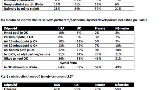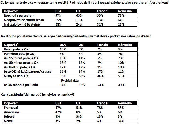 - Ukazuje se také, že mnozí zjevně začínají upřednostňovat tablety před svými lidskými partnery. Na otázku, jak moc by je naštvalo nevratné rozbití iPadu ve srovnání s rozpadem vztahu se svým partnerem odpověděla téměř polovina Francouzů a Američanů (45 procent a 43 procent) a třetina Britů (35 procent), že by je stejně nebo více rozrušila ztráta jejich milovaného iPadu. Němci zatím vykazují mnohem větší oddanost ke svým lidským protějškům, výše uvedený postoj tam sdílí jen 27 procent.