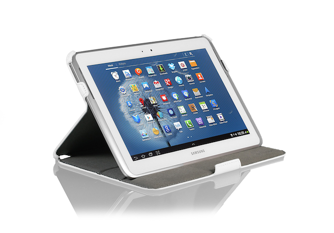 Tablet Galaxy Note 10.1 je v predaji v dvoch farebných prevedeniach, a to v bielom a sivomodrom. Nám sa na recenziu ušla biela verzia. To, ktorá je krajšia, sa nedá objektívne zhodnotiť, no v obidvoch farebných verziách vyzerá Galaxy Note 10.1 veľmi dobre. Dizajnovo tablet od konkurencie odlišuje najmä strieborný rám okolo displeja, ktorý zasahuje aj do okrajov zariadenia. Ako je už z názvu jasné, prednej strane dominuje displej s uhlopriečkou 10.1 palca, nejde však o AMOLED, ale o PLS displej (alternatíva k IPS LCD displejom). Proti škrabancom už klasicky chráni displej sklo Gorilla, ktoré pokrýva takmer celú prednú stranu okrem lesklého sivého rámu. Nad displejom sa nachádza 1,9Mpix kamera a vedľa nej je umiestnený senzor okolitého osvetlenia pre automatickú reguláciu jasu displeja. Na čelnej strane ešte prekvapivo nájdeme dvojicu reproduktorov, ktoré sa skrývajú pod striebornými mriežkami. Väčšina tabletov má reproduktor(y) umiestnené na zadnej strane, v tomto prípade zvuk smeruje priamo k používateľovi, čo je určite plus.