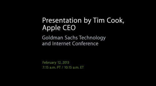 Přenos začíná zítra, tedy 12. 2. 2012 v 16:15 našeho času. Zajímavé je že Apple nabídne vystoupení Tima Cooka živě na svých stránkách i když přímo nesouvisí se samotnou společností. Svítá tak čím dál větší naděje že živý přenos posledního představení novinek společnosti Apple, kde Tim Cook a jeho tým uvedl iPad mini, 13″ MacBook Pro Retina a nový iMac, nebyl pouze výjimečnou akcí ale přímého přenosu se dočkáme také u dalšího uvádění novinek společnosti. Mimochodem pokud se zajímáte o Goldman Sachs, vyšla skvělá kniha vysvětlující vznik jedné z nejvlivnějších korporací na světě, kterou mohu jen doporučit. Najdete ji pod názvem Partnerství: zrození Goldman Sachs.
