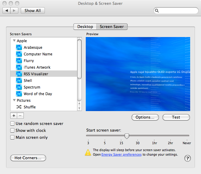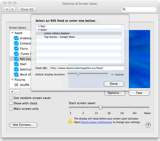 Samozřejmě můžete zvolit také čas za který se má spořič spustit a další možnosti, které se nastavují přímo v Energy Saver preferences. Pokud tak například vyrazíte na oběd a máte nastavený spořič displeje s RSS z Letem světem Applem, okamžitě po příchodu vidíte všechny nové články, které vyšli během vaší nepřítomnosti u počítače a jednoduchým stlačením příslušené klávesy si je můžete přečíst celé přímo na našem serveru.