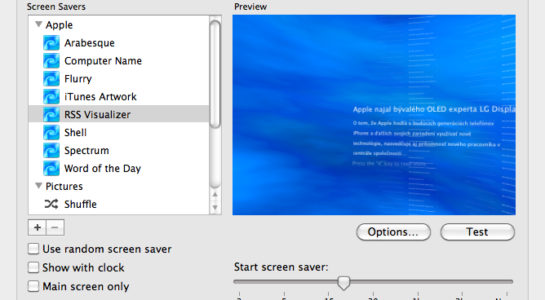 Otevřete System Preferences a zvolte možnost Desktop and Screen Saver a záložku Screen Saver. Nyní stačí zvolit jako spořič obrazovky RSS Visualizer a následně možnost Options. Právě v Options můžete zvolit zdroj RSS a zadat sem například www.letemsvetemapplem.eu/feed, díky čemuž můžete mít články z LsA přímo ve spořiči displeje. Pod položkou Article display duration pak můžete zvolit dobu, po kterou chcete jednotlivé zprávy zobrazovat. Pokud se vám následně bude některá ze zpráv líbit a chcete si ji rovnou přečíst, stačí zvolit číslo pod které je zobrazeno pod úvodem článku ve spořiči displeje a okamžitě se spustí prohlížeč internetu, který vás přesměruje na daný článek.