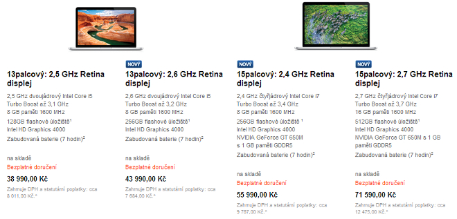 Apple zároveň zo svojej ponuky odstránil výkonnejšiu verziu klasického 15″ MacBook Pro, ktorú bolo možné zohnať už od 2199 dolárov. Je teda pravdepodobné, že Apple hodlá už tento rok kompletne nahradiť klasické modely notebooku za tie výkonnejšie, ľahšie a s Retina displejom. 200-dolárový rozdiel v cene sa zrejme dotkne i Slovenskej Republiky, kde je v súčasnosti možné zohnať 13″ MacBook Pro Retina až za 1 749€. Počítače už sú dostupné na oficiálnom českom Online Store spoločnosti.