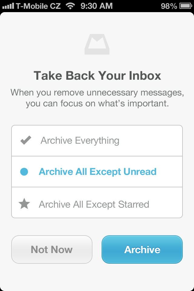 Kromě funkce snooze můžete e-maily jednoduše odstranit či přesunout do archivu a to prostým táhnutím zprávy doprava. O tom zda bude zpráva archivována (následně označeno jako přečteno) či přímo smazána rozhodne délka vašeho tahu. Pokud provedete ono gesto v opačném směru máte možnost zprávu „snooznout“ a následně si vybrat, na jak dlouhou dobu (na výběr máte pozdější hodinu téže den, večer, následující den, víkend, další týden, měsíc popřípadě i poněkud neurčitou možnost někdy a také i možnost manuálně zadat datum, kdy se zpráva znovu připomene) nebo zprávu přesunout delším tahem do jednoho z tzv. lists, nebo-li do seznamů, které můžete libovolně upravovat, popřípadě si vybrat ze základních (k nákupu, k přečtení, k prohlídnutí). Tyto gesta lze aplikovat i hromadně a to pouhým scrollováním na konec seznamu přijatých e-mailů a poté využít jedno z aktivních tlačítek k vytvoření požadovaného gesta. Díky tomu, tak snado můžete dosáhnout pravidelně i prázdné složky příchozí pošty, za což budete odměněni i pohledem na každodenně se měnící fotografii.