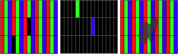 *z ľava do prava: Tmavý pixel, Svetlý pixel, Špina na displeji