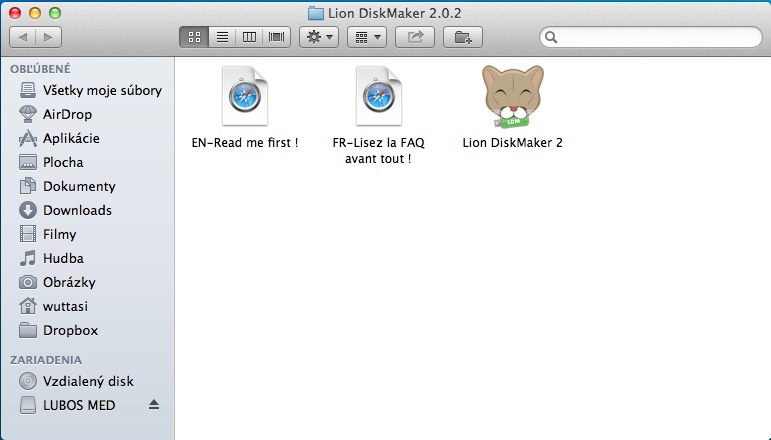 1. Po stiahnutí OS X Mountain Lion resp. OS X Lion, po pripojení USB disku do Mac-u a po rozbalení stiahnutej aplikácie otvorte súbor s názvom Lion DiskMaker 2, ktorý môžete vidieť na obrázku nižšie.