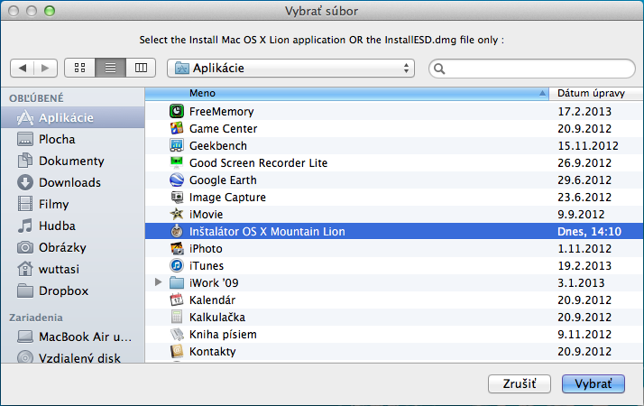 2. Po jeho otvorení vám vyskočí tabuľka s možnosťou výberu OS, ktorý chcete použiť na vašom USB. V mojom prípade som zvolil „Mountain Lion (10.8)“