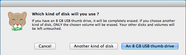 4. Po lokalizácii inštalačného súboru a stlačení tlačítka „Vybrať“ budete opýtaní na druh disku, ktorý chcete použiť ako bootovacie médium. V mojom prípade to je „An 8 GB USB thumb drive“ aj keď v MacBooku mám zasunuté 16 GB USB.