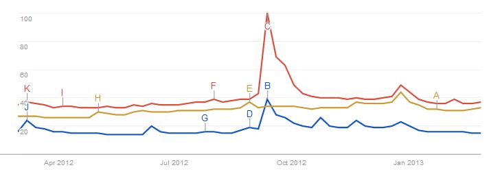 Druhý graf pak ukazuje data za posledních dvanáct měsíců, ze kterého je již velmi dobře patrný rozdíl mezi společnosti Apple, Samsung a telefonem iPhone. Zatím co se Samsung blíží k iPhone, vyhledávání Apple samotného stagnuje. To se samozřejmě může zdát na první pohled jako zanedbatelná drobnost, které si není potřeba všímat, na druhou stranu se však jedná o velmi zajímavý ukazatel zájmu spotřebitelů o jednotlivé společnosti. Je tak jasně vidět, že zatím co se spotřebitele zajímají o společnost Samsung globálně a zajímají je všechny produkty korejského výrobce, v případě Applu je zajímá především jediný produkt iPhone. Samsung je tak schopen lépe propagovat celé své portfolio produktů a prodávat to, čemu se mnozí fanoušci Apple smějí se slovy „přece bych si nekoupil mobil od výrobce mikrovlnky“.
