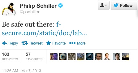 Na to to Schiller reagoval příspěvkem na sociální síti Twitter, ve kterém kromě odkazu na průzkum zveřejnil také slova, která lze volně přeložit jako „Buďte na pozoru“ nebo „buďte tam v bezpečí“. Zpráva zmiňuje několik zajímavých aspektů o Androidu, včetně statistiky, která říká že z 300 mobilních hrozeb v roce 2012 jich bylo určeno 79% pro Android a jen 0,7% pro iOS. Celkově zpráva označuje iOS jako jeden z nejbezpečnějších mobilních operačních systémů. Apple nemá ve zvyku své konkurenty příliš popichovat, tentokrát však F-Secure evidentně Schillera potěšilo.