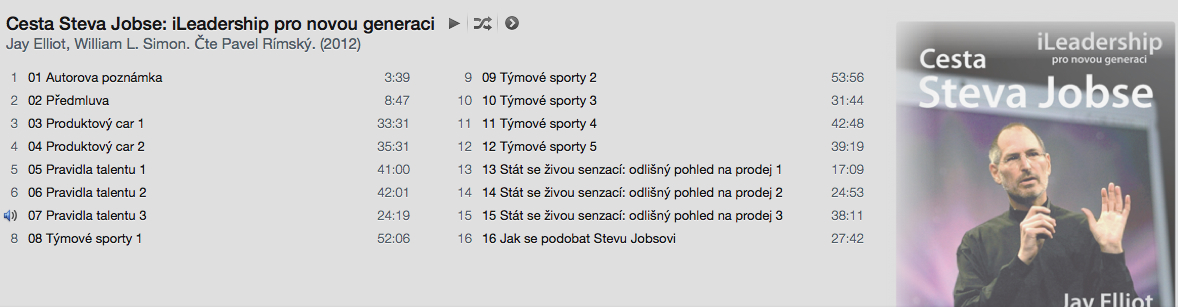 Kniha obsahuje 14 plnohodnotných kapitol, plus předmluvu a autorovi poznámky, které se dozvíme na začátku poslechu. Kapitoly mají v průměru 30 minut a celková délka knihy je 8 hodin a 36 minut. Těchto osm a půl hodiny strávíte ve společnosti Pavla Rímského, který vám poutavě vypráví příběh. Přečte pohled na jednoho z nejúspěšnějších businessmanů a technologů, které kdy svět poznal. Pavel Rímský, člen souboru Divadla na Vinohradech a jeden z nejlepších současných speakerů, Vám knihu Jay Elliota svým projevem dostane pod kůži. Bývalý Senior Vice President Applu nebyl jen jedním z manažerů společnosti, byl to člověk, jehož názory chtěl Steve znát, byl to muž jenž byl u klíčových okamžiků života Steva Jobse, jakožto i u klíčových rozhodnutí celé společnosti Apple.