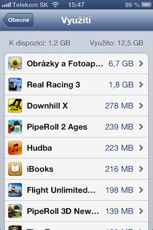 Stačí když přejdete do Nastavení – Obecné a následně Využití, kde lze zobrazit vše, o ve vašem telefonu, multimediálním přehrávači nebo tabletu zabírá místo. Následně stačí  dané položky zobrazit a vymazat to, co již nepotřebujete. Velmi snadno tak můžete smazat například knihovnu fotografií, kterou máte většinou uloženou také v počítači nebo v iCloudu a přímo v zařízení ji nepotřebujete, tedy lépe řečeno se bez ní obejdete v případě, kdy dochází místo. Mimochodem právě v položce Využití vidíte u jednotlivých aplikací také další dokumenty a data, která v iTunes vidíte jako další položky.