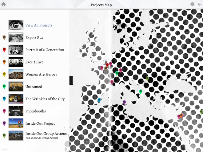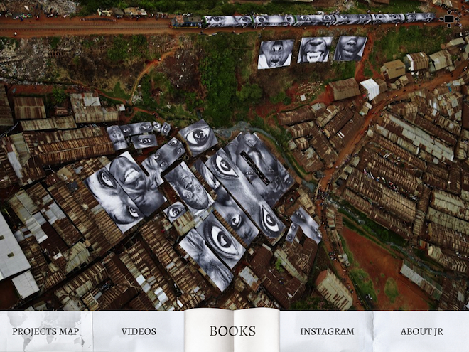 Nás aplikace zajímá především z toho důvodu, že se jedná o další ukázku jak skvěle je možné na iPadu prezentovat své projekty a ukázat pomocí iTunes App Store celému světu to co umíte. Aplikace nabízí pouze skromné menu, rozdělující ji na sekce Project Map, Videos, Books, Instagram a About JR. První sekce nabízí interaktivní mapu, samozřejmě jak jinak než umělecky podanou, jenž nás provede místy, na kterých JR tvořil své projekty. Jakmile kliknete na dané místo, okamžitě se zobrazí informace o daném projektu, včetně fotografií a videí. Sekce Videos nabízí desítky poměrně dlouhých videí, které prezentují JRovi projekty. V sekci Books naleznete knihy které je možné zakoupit v iBooks. V instagram pak aktuální fotografie z osobního Instagramu a About JR obsahuje fotografii, popis a video z TED, kde JR vyhrál prestižní cenu.